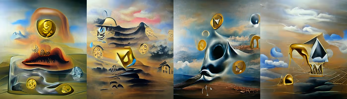 AI Art. Text to image generated by Artificial Intelligence. Cryptocurrencies in Artificial Intelligence eyes. Surreal art.