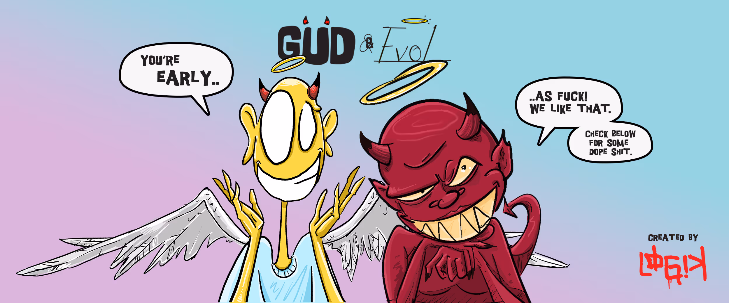 The best buds, Gud & Evol, were created with the halo and horn, one representing a heaven angel and the other a demon from down under. This illustrates that good and bad are ultimately subjective. Whether an action is good or evil can depend on a variety of factors, including the intentions of the person performing the action, the consequences of the action, the cultural or societal context in which the action is performed, and the values and beliefs of the individual or group making the judgment.