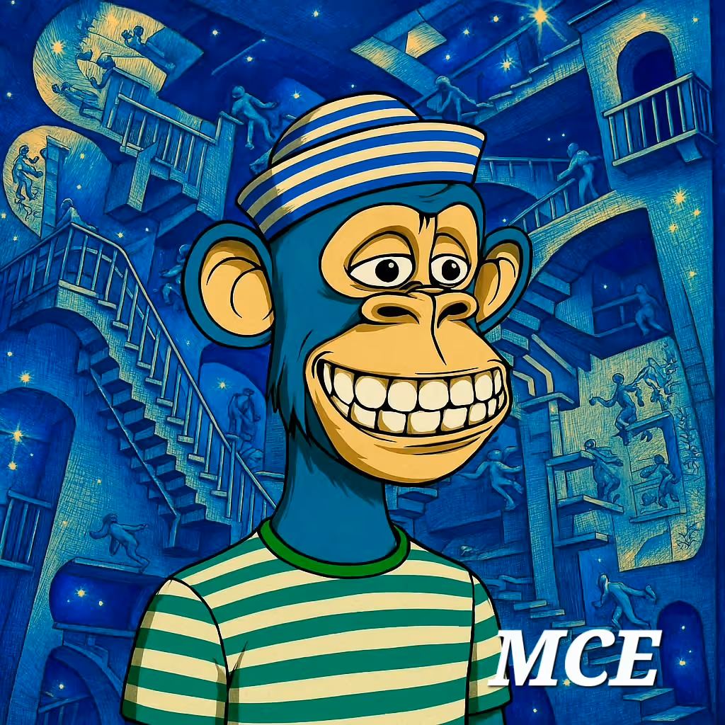 MCE nft in MC Escher style M.C. Escher (1898-1972) is an artist influenced by the world of mathematics. Playing with perspective and theorems, his works are treasures of imagination. Throughout his life, he created thousands of works filled with impossible architecture. To this day, we owe him drawings that have transformed our perception of art.