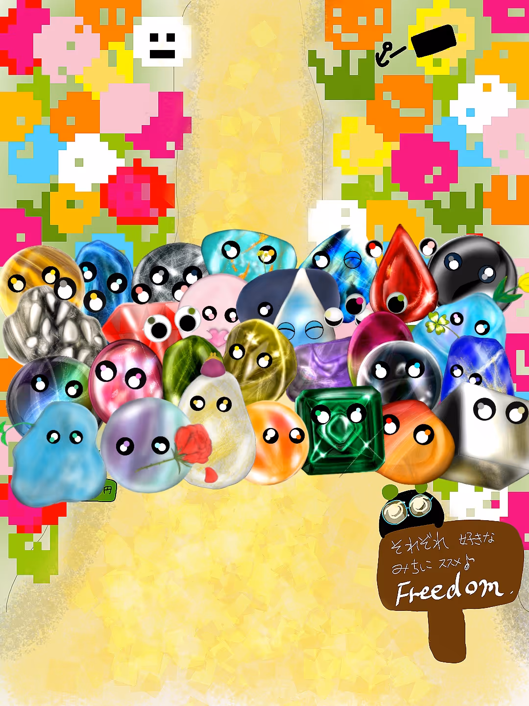 Mineral-chan. Cute stone falling on the roadside.small yellow flower.Powerstone