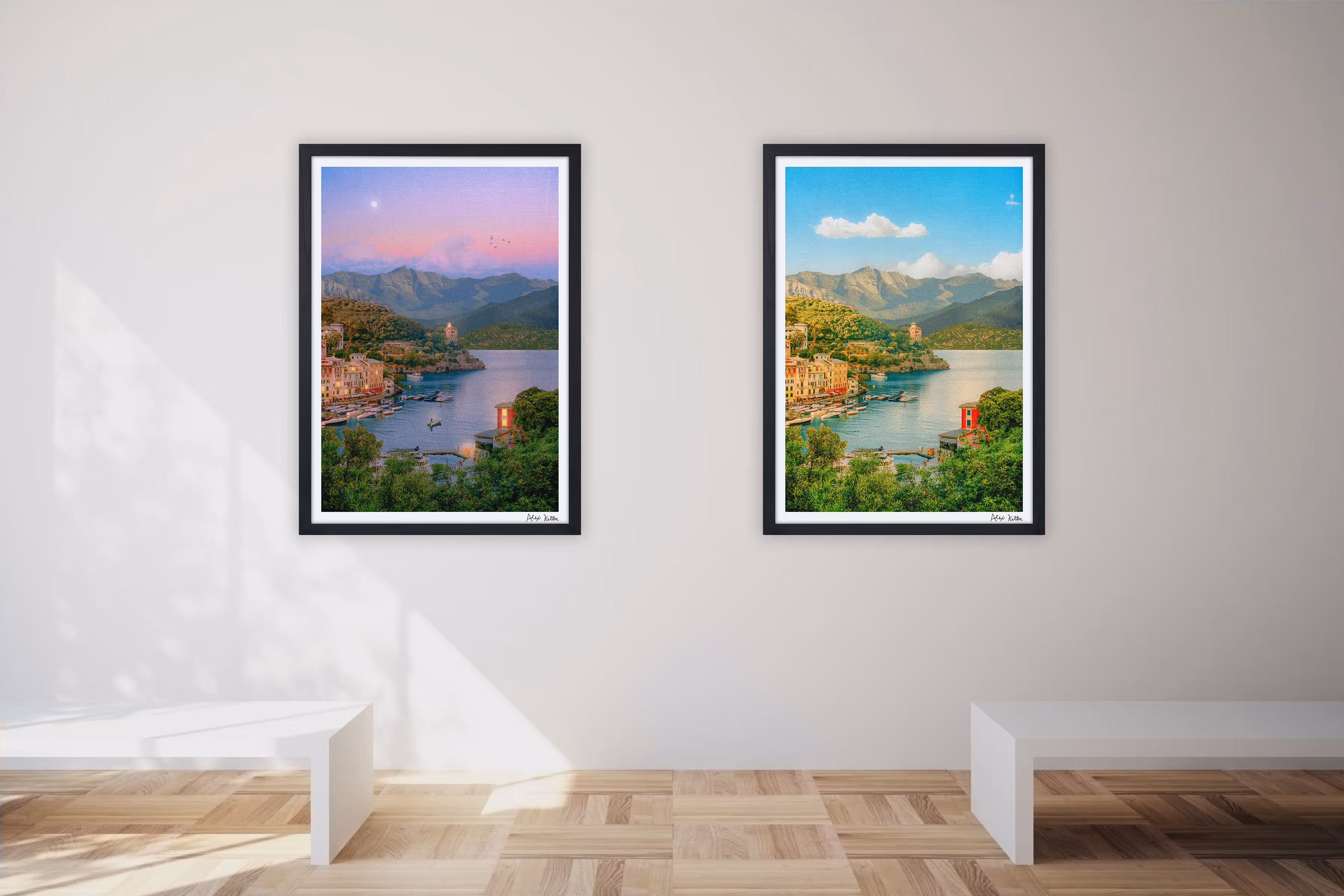 The piece began with photographs taken in Portofino in May 2025, merging multiple views of the harbor into a fuller, more immersive foreground. From there, coastal and alpine landscapes coexist, expanding the scene beyond geography and into feeling.