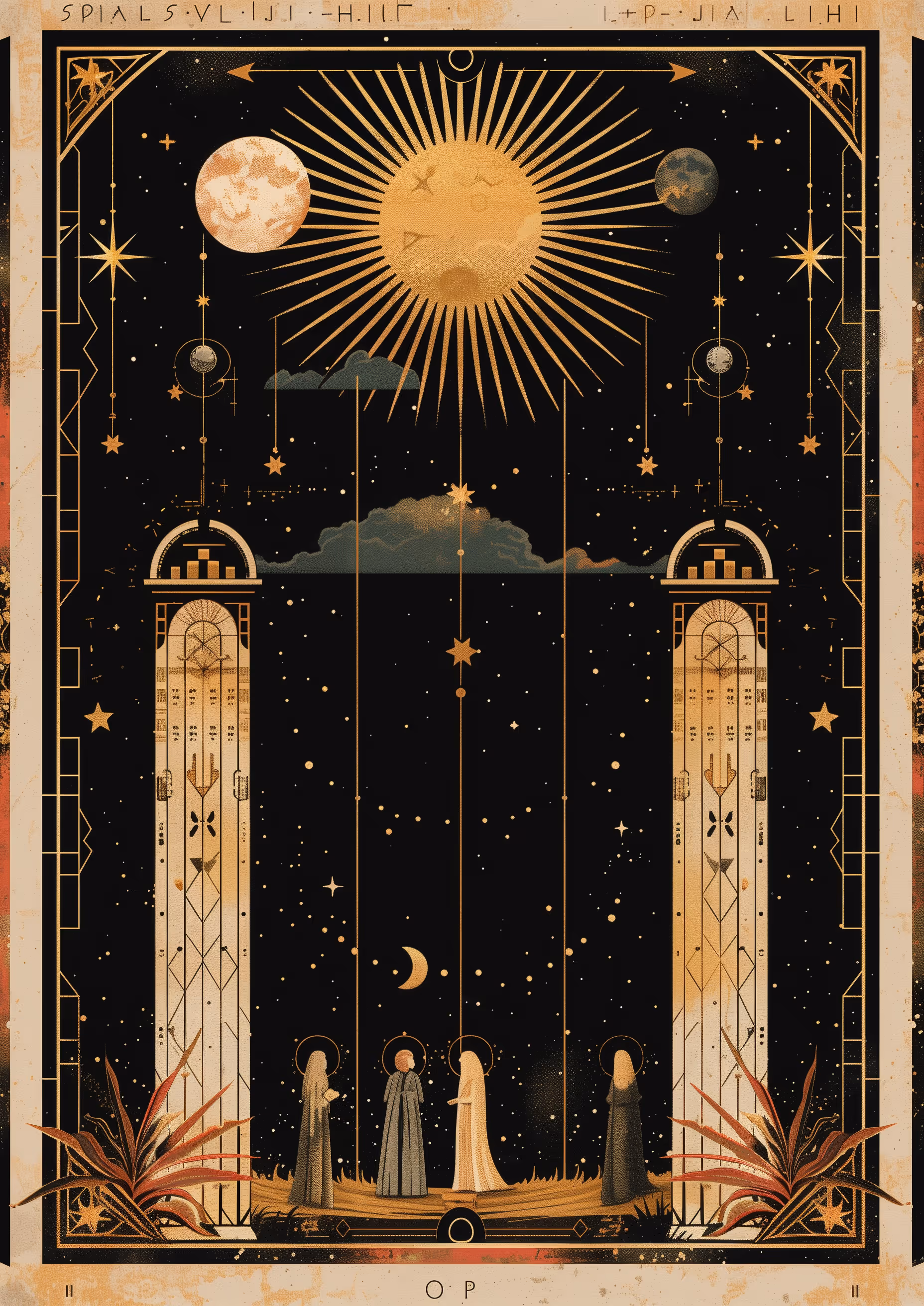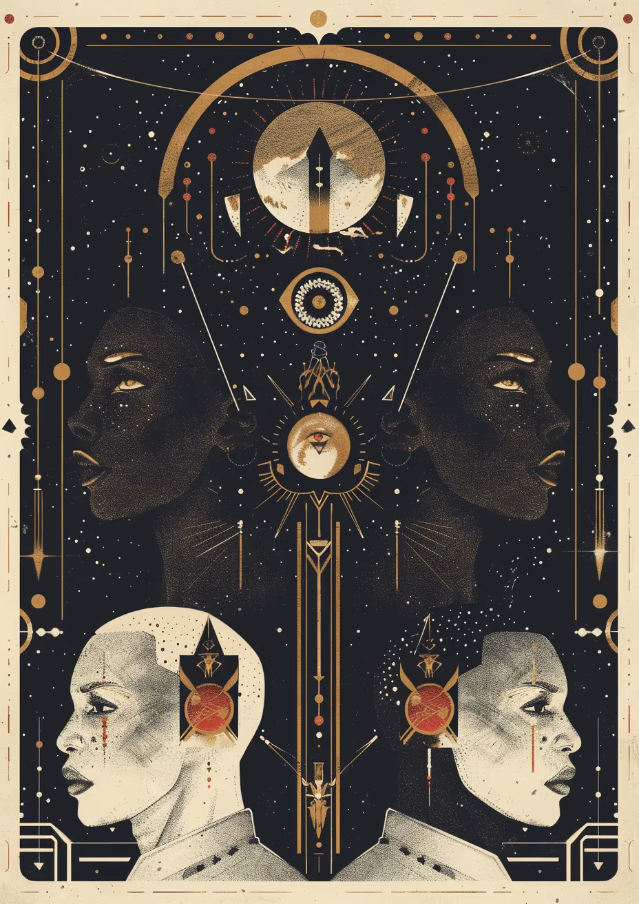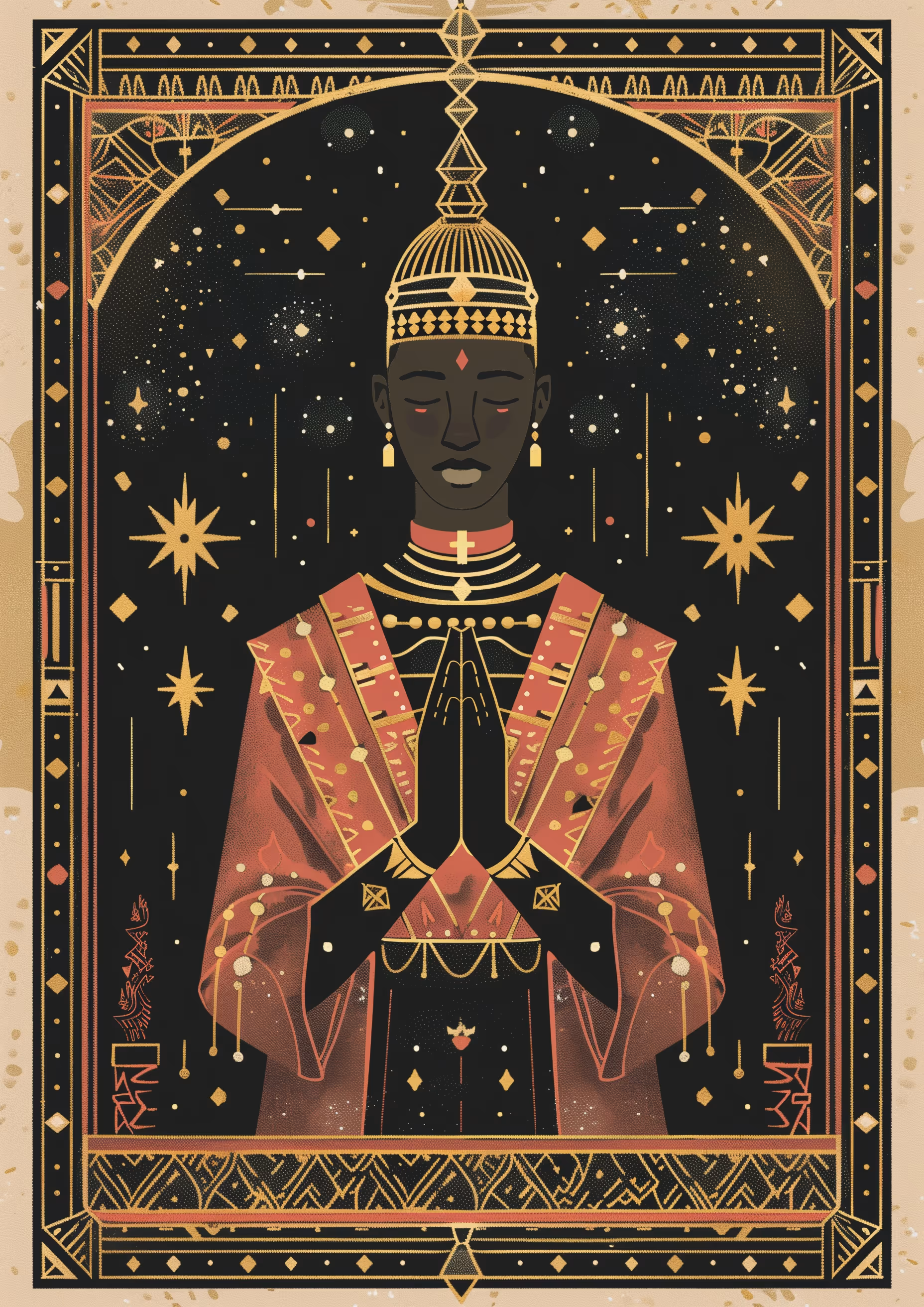 The figures, surrounded by celestial symbols, embody the pursuit of higher consciousness, with the gold and black palette accentuating their divine journeys. The artworks reflect sacred rituals and practices, portraying serene moments of alignment with the cosmos and highlighting the bridge between the physical and the spiritual.