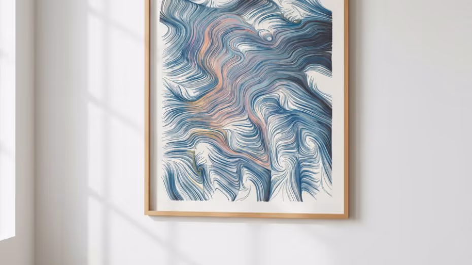 Subtle gradients, shifting from deep indigo to pale blue, evoke motion and depth, like wind, water, or thought captured in stillness. Golden and copper veins reveal emotional undercurrents — moments where logic wavers and intuition takes the lead. Each piece is not pure abstraction but a moment of revelation: a glimpse of the invisible agreeing, at last, to be seen.