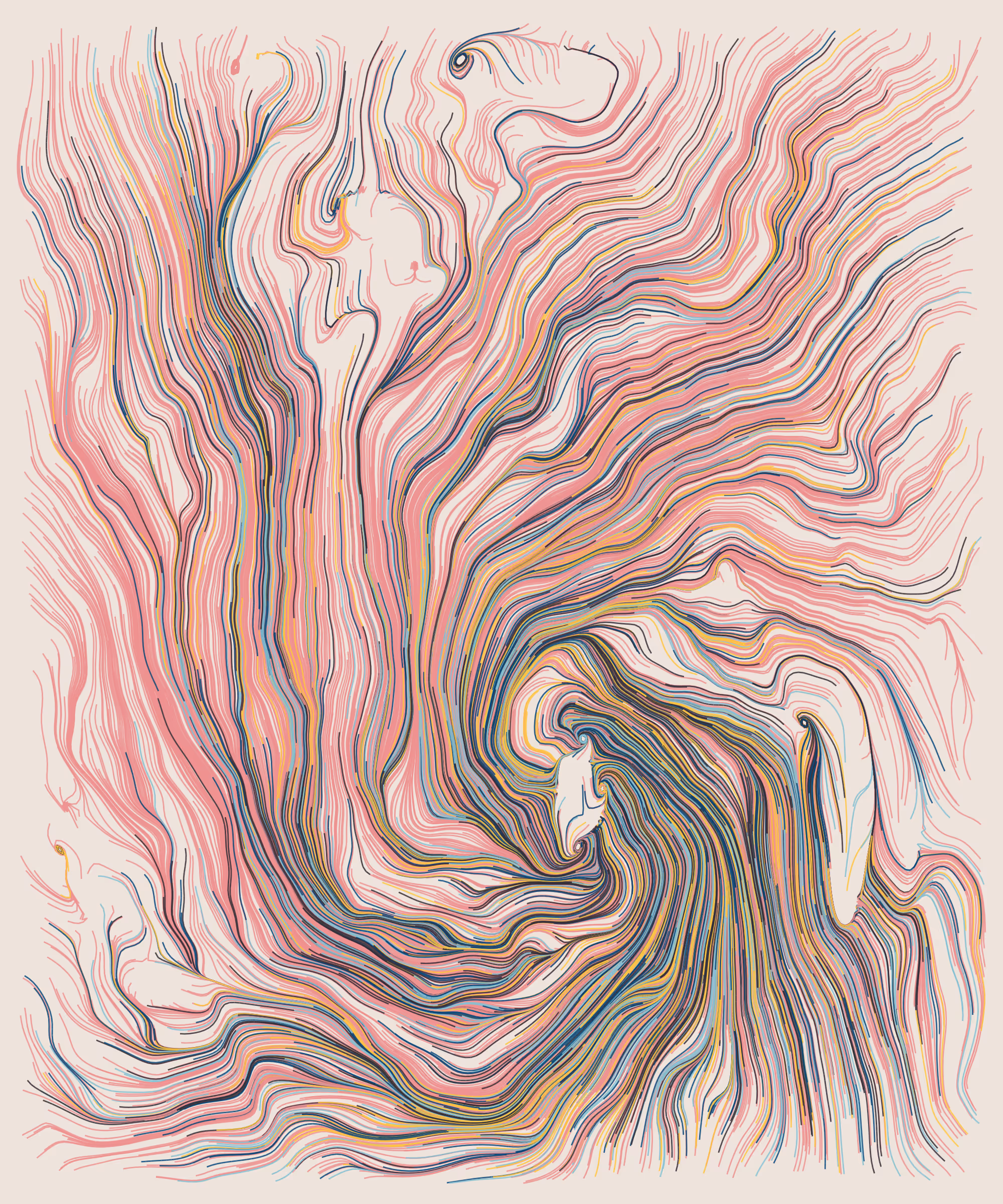 Spectoria is a generative art series where dense linear structures meet restrained, balanced color fields. The core idea is to visualize how motion emerges from invisible centers of force, turning digital space into a living field of flows. Each work becomes a reflection of inner movement — where cold reason meets desire, memory transforms into form, and fleeting impulses leave visible traces.