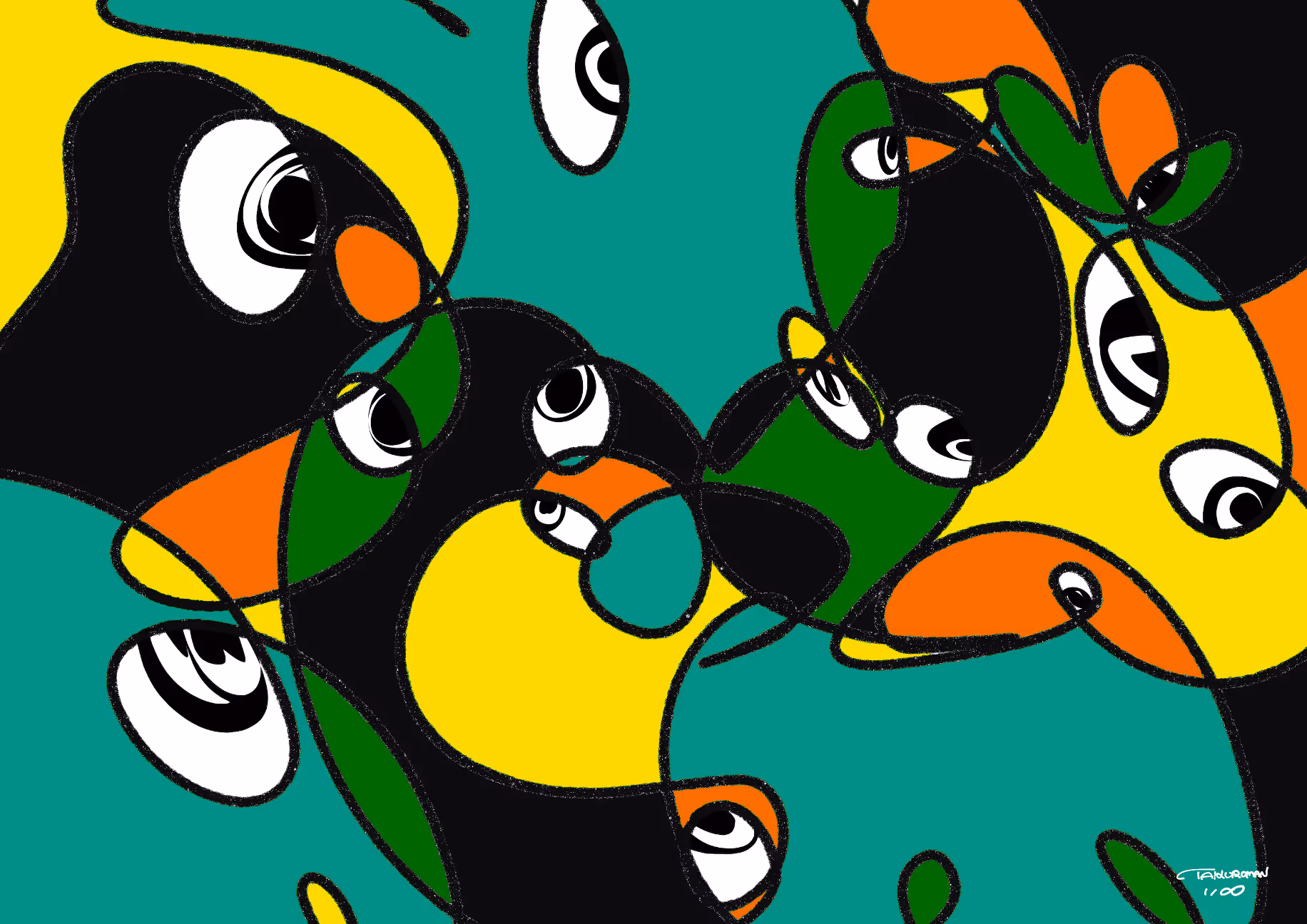 "Art Happens." The shape came out by drawing by coincidently is intuitively colored and completes as it is. So same art can't be made again.