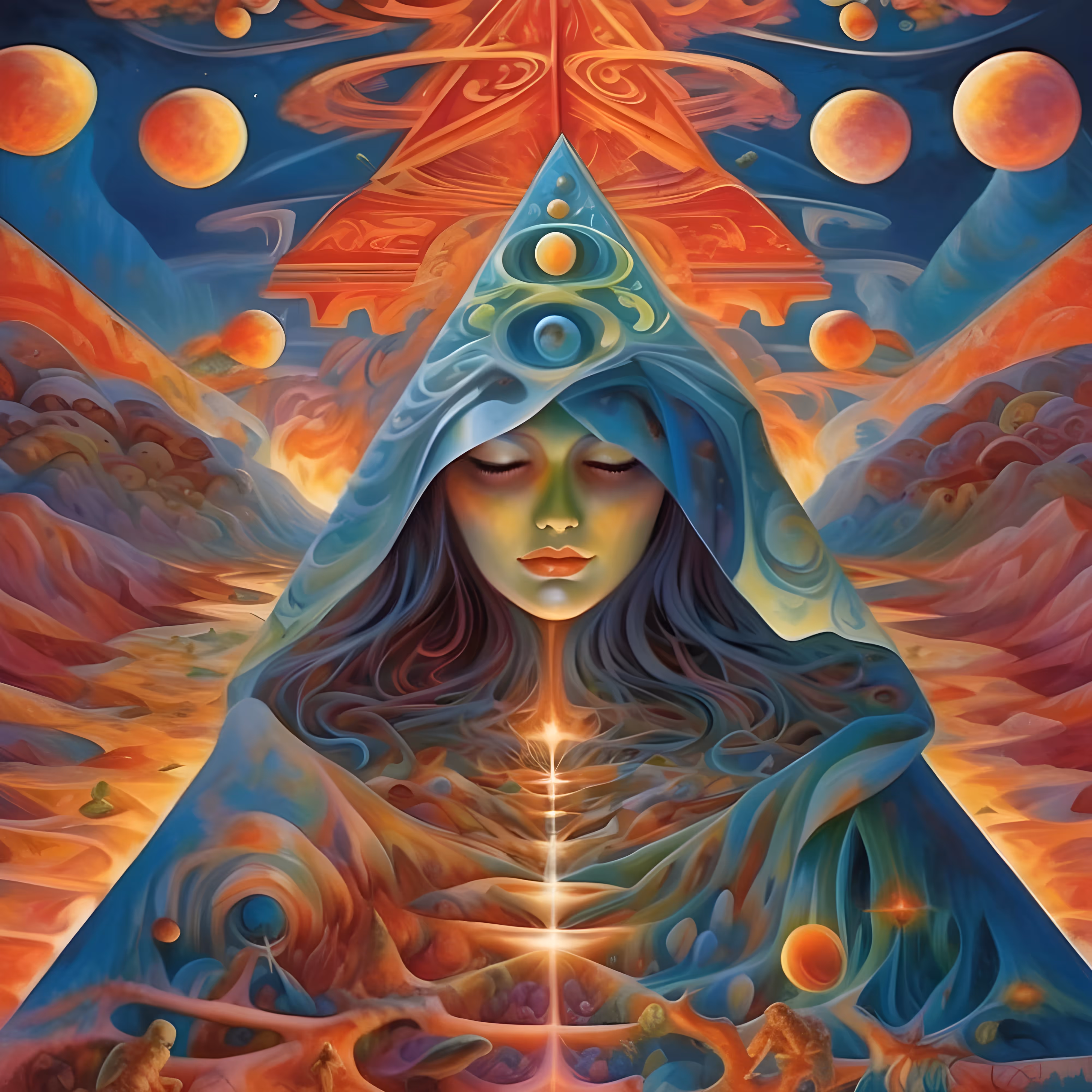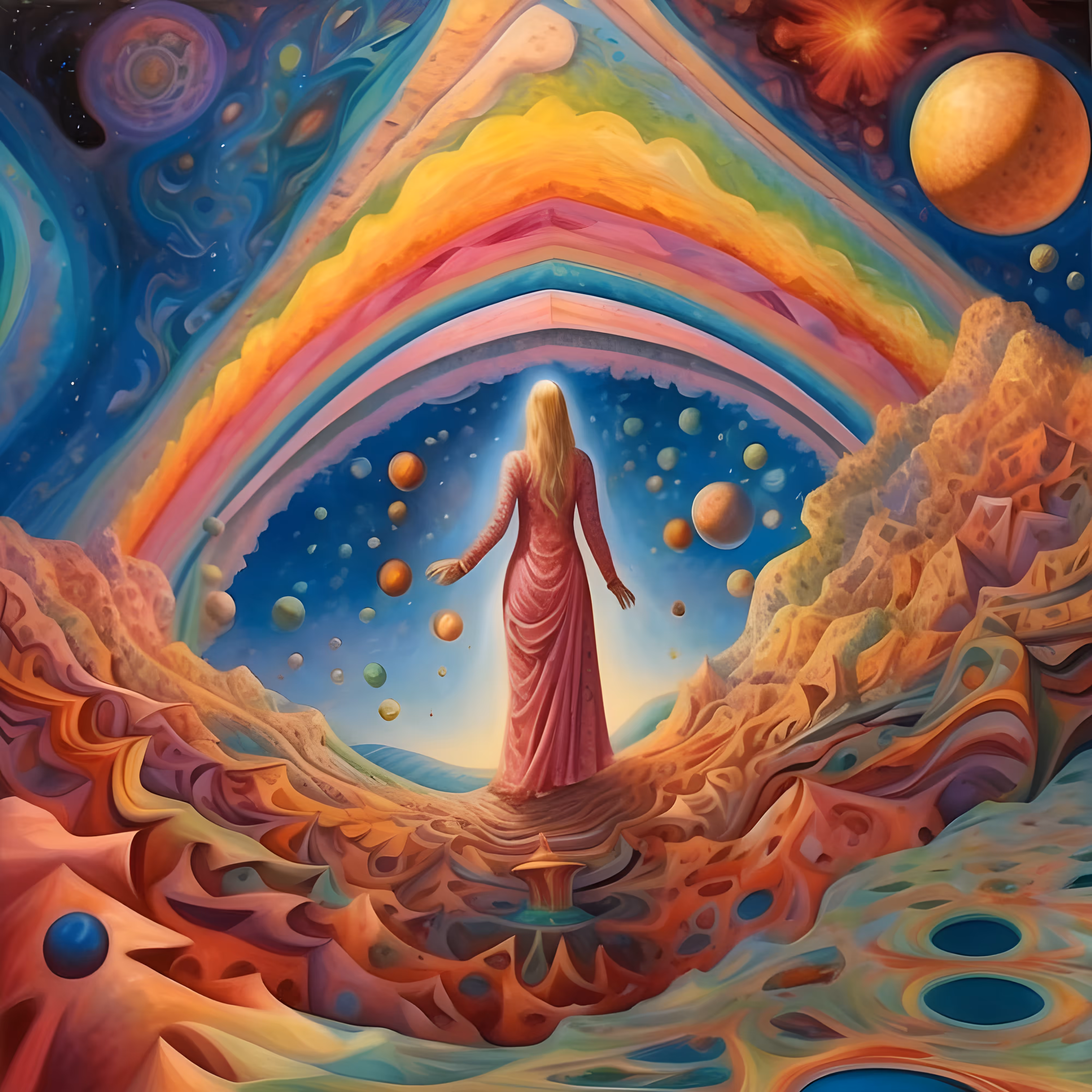 As voyagers, we are ushered through a spectrum that extends beyond the visible, into realms of possibility where light bends and time yields to the will of creation. Here, indigo depths speak of mysteries ensconced in the cosmos' embrace, and emerald spirals beckon to secrets just beyond reach, while golden threads illuminate the paths between worlds.