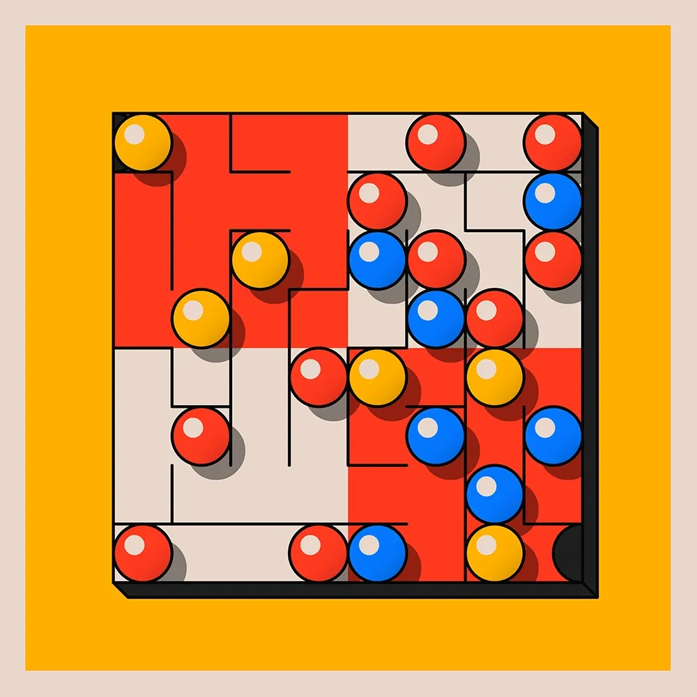 Flatland I is a series of 24 pieces inspired by the aesthetics of 2D games to create an abstract universe. Each piece features distinct compositions and color combinations, covered in shapes trapped in a two-dimensional maze, with movement restricted to only four specific directions (up, down, right, left).