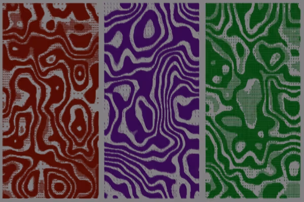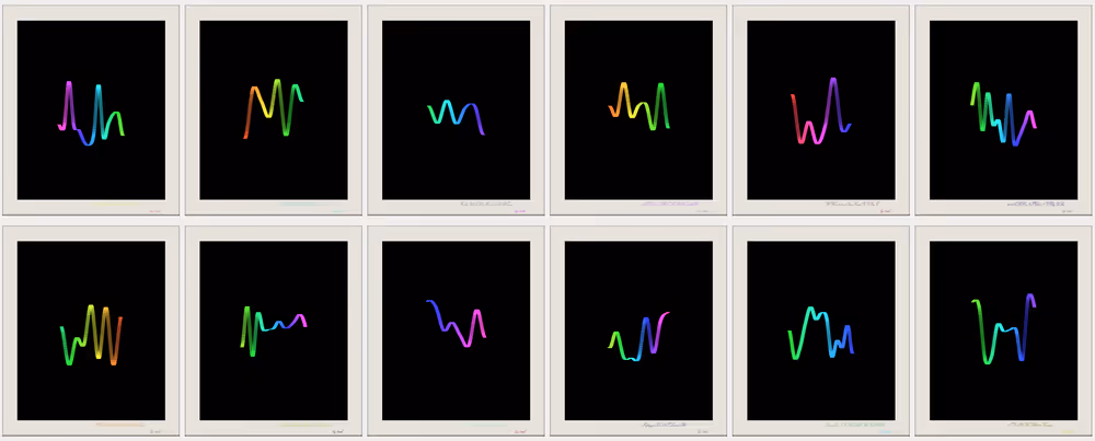 FluxEcho starts with a random seed. Code loops through the canvas, computing noise angles, random colors, and sine ripples. Shapes shift, forming unique NFTs driven by algorithms