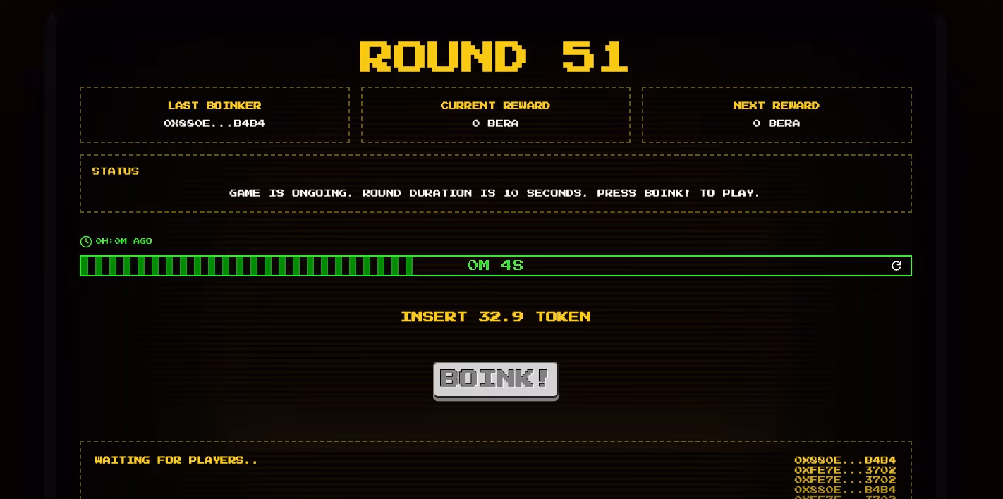 Boink! is a high-stakes mini-game on Berachain in which precise timing is essential for winning $BERA rewards. In this game, you'll compete in perpetual rounds for rewards coming from the tax system of the $BOINK token. Your sole objective? To be the last person to boink before the timer runs out. Challenge the clock and other players, reset the timer with each boink, and conquer this fierce player-versus-player game to claim your rewards.