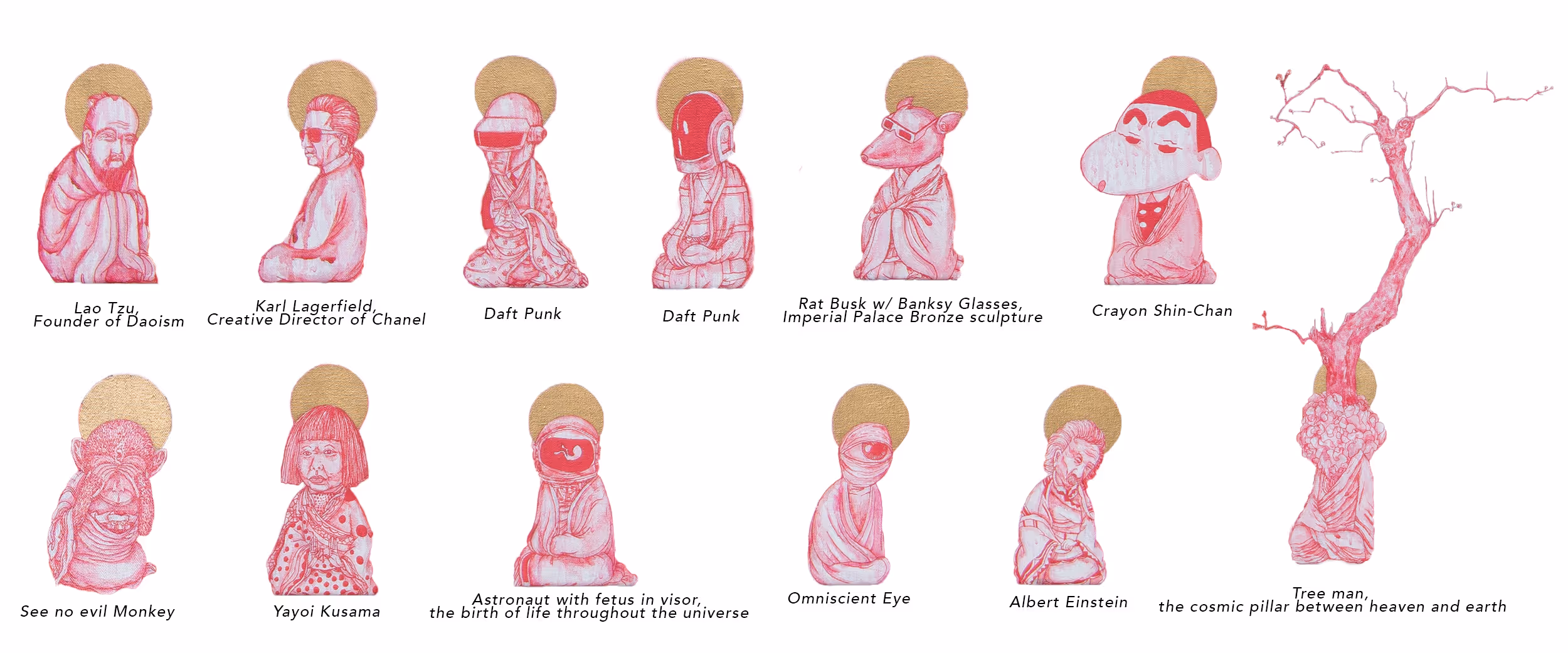 In blending contemporary Pop and Urban Art aesthetics with more ancient oriental sensibilities, the result is a rich and deeply layered universe that is both simultaneously Zen and in a constant state of spiritual conflict.