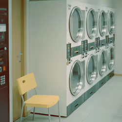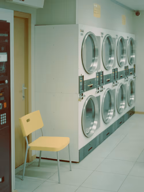 Red chairs in laundromat