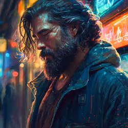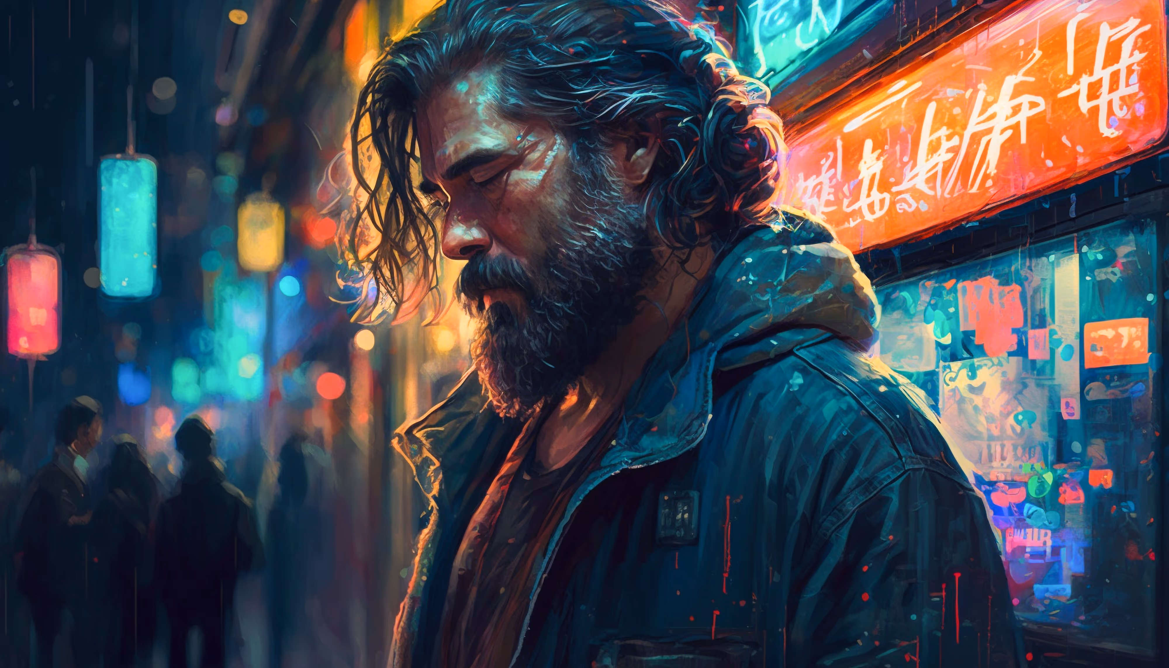 Manly Bearded Long-haired Man in Japan, Cyberpunk Style. AI Art.