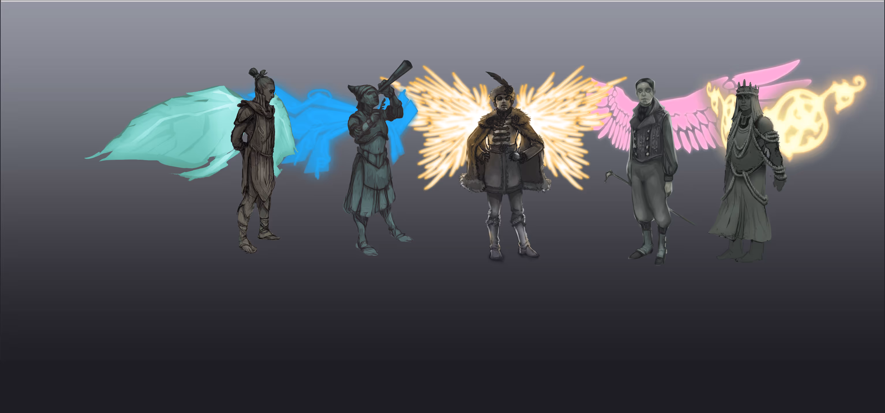 15,000 years ago, the Hadeen unlocked the secret of flight. By literally reshaping the spinal column of a newborn, the Glim is channeled (after years of practice) to create 'wings' of pure energy. This process is called 'Glyphing' and it is the single most important ceremony for the vast majority of Hadeen. Glyph color and patterning communicates not only culture and place of origin, but one's individual identity – like a highly personalized coat of arms.