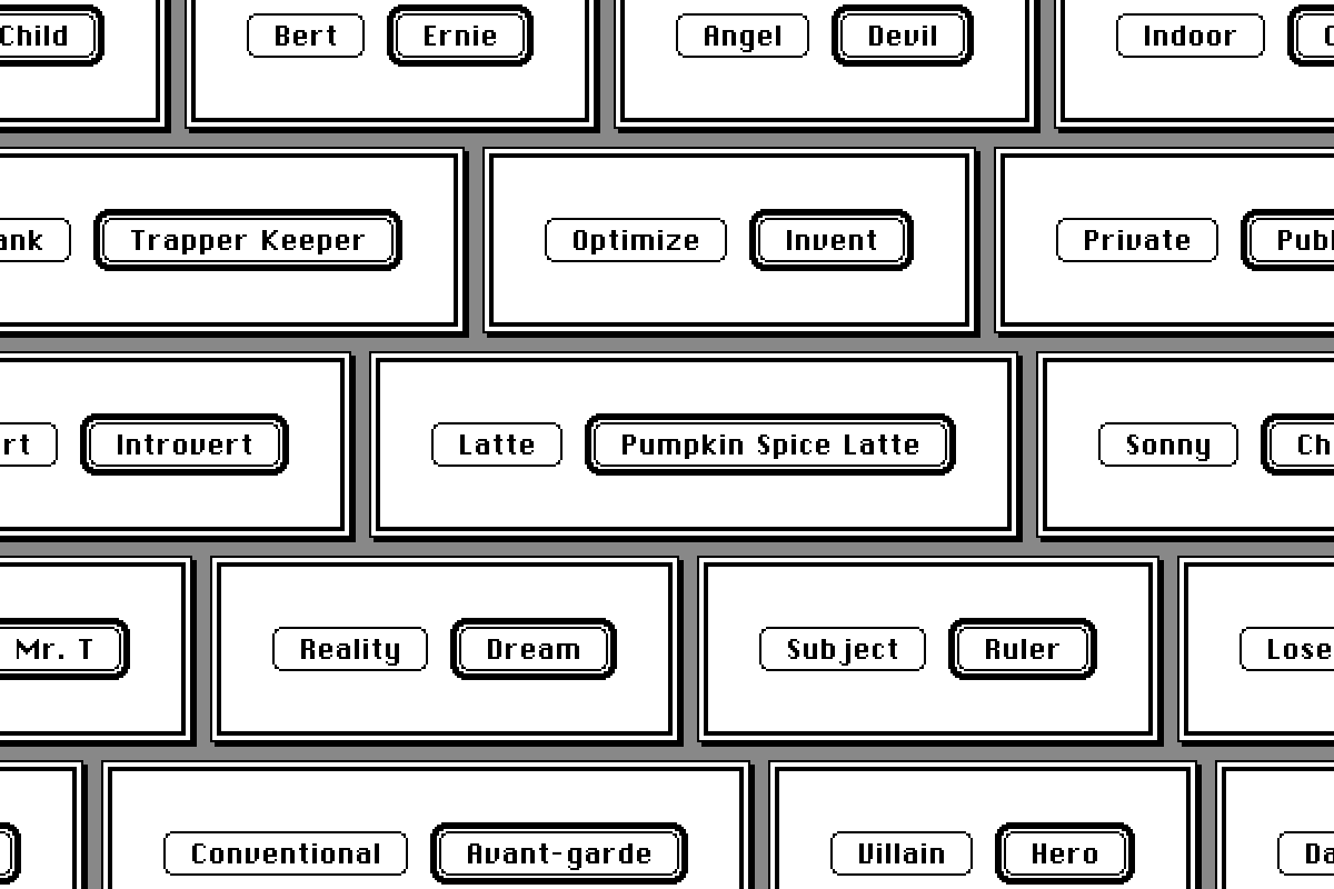 Dialog Box is a playful generative art project that invites viewers to engage with the concept of choice in the digital age. Inspired by the early Mac OS, the artwork presents an interface of two buttons, each symbolizing a choice steeped in 80s and 90s pop culture, from the serious to the lighthearted.