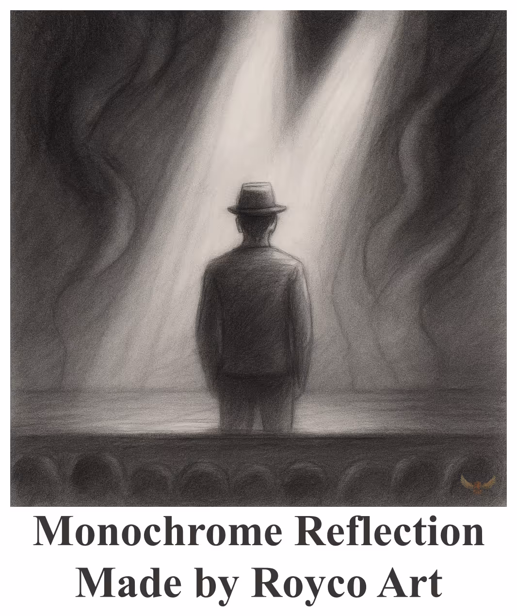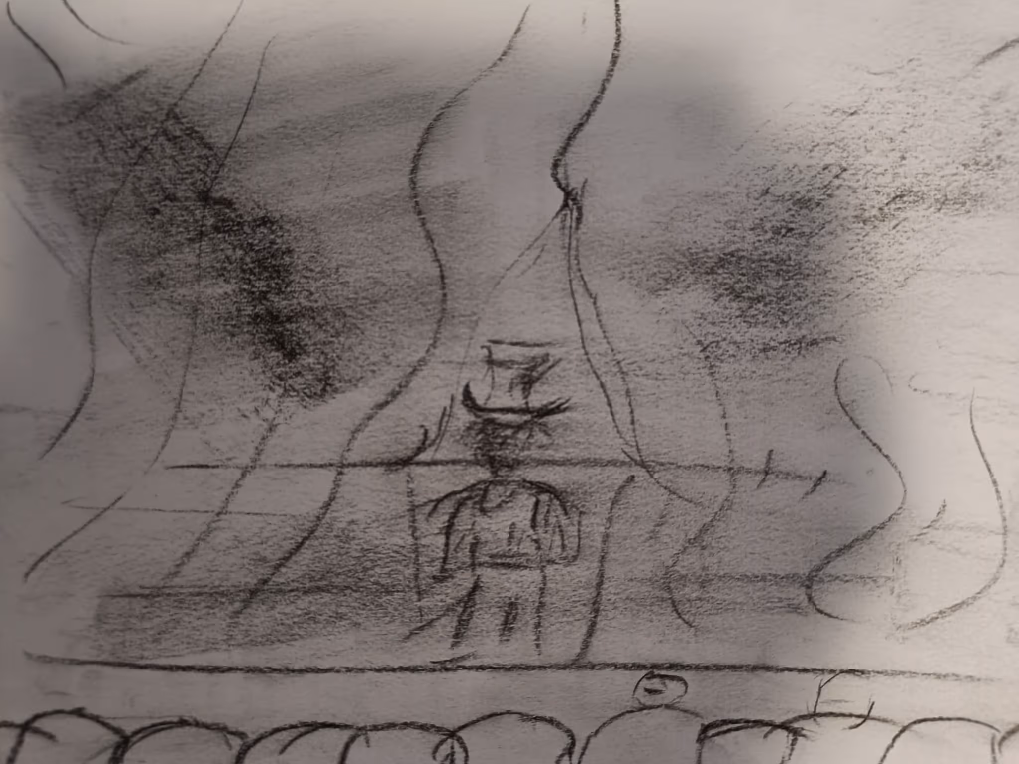 I picked up the pencil without a plan, letting my hand move instinctively. What emerged was a raw impression of emotion: a silhouette on a stage, surrounded by smoky lines and darkness. I didn’t yet understand it, only that it resonated.