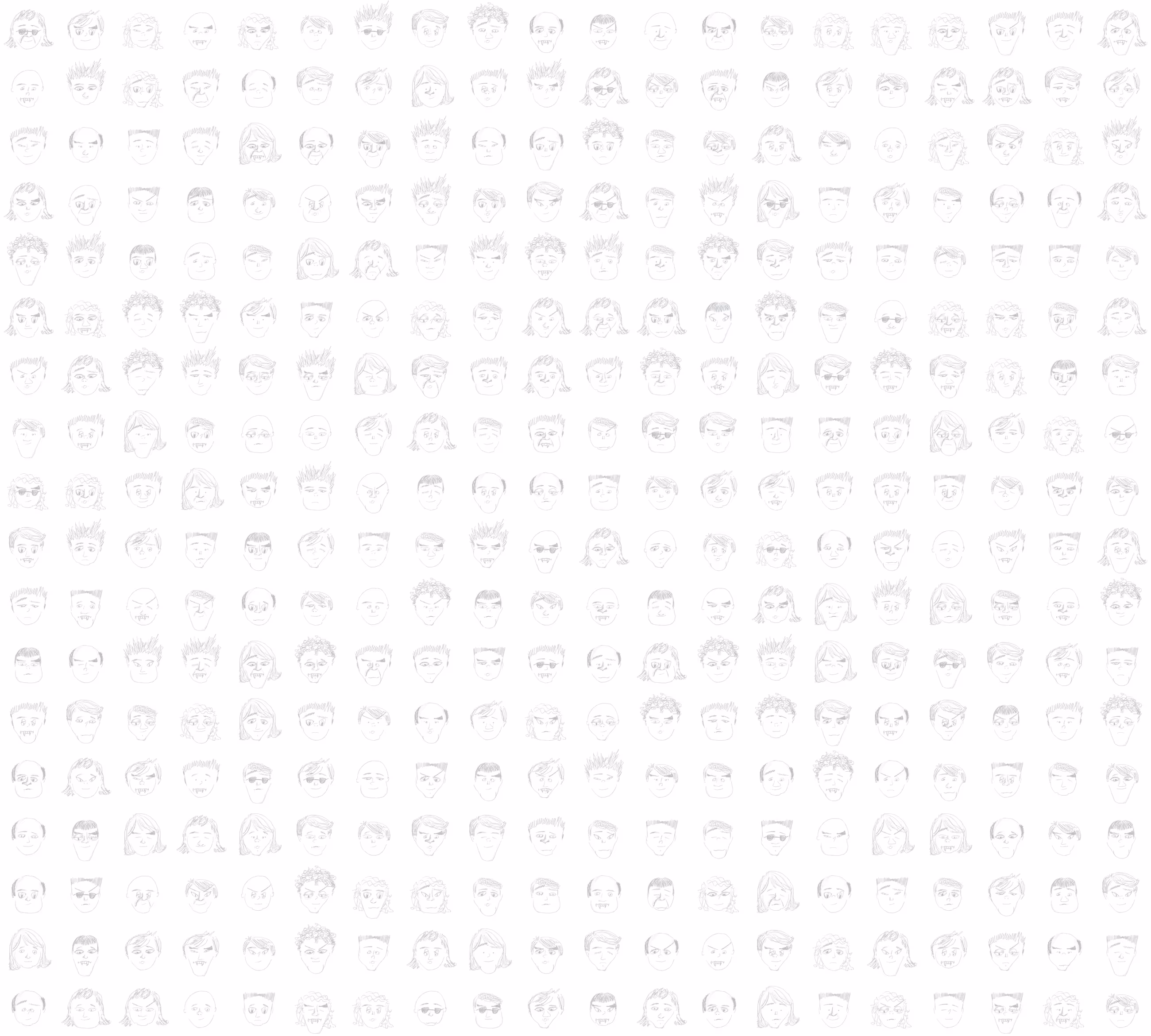 The scribbles, they come together to form faces. They is noses and eyes and mouths and brows and chins and hair. Without, there be not face; and with their many combis, there be many, many faces. In this set existses 9,999 of such combis, each unique in their making. The faces is just the beginnings of the makings, but they must exist first.