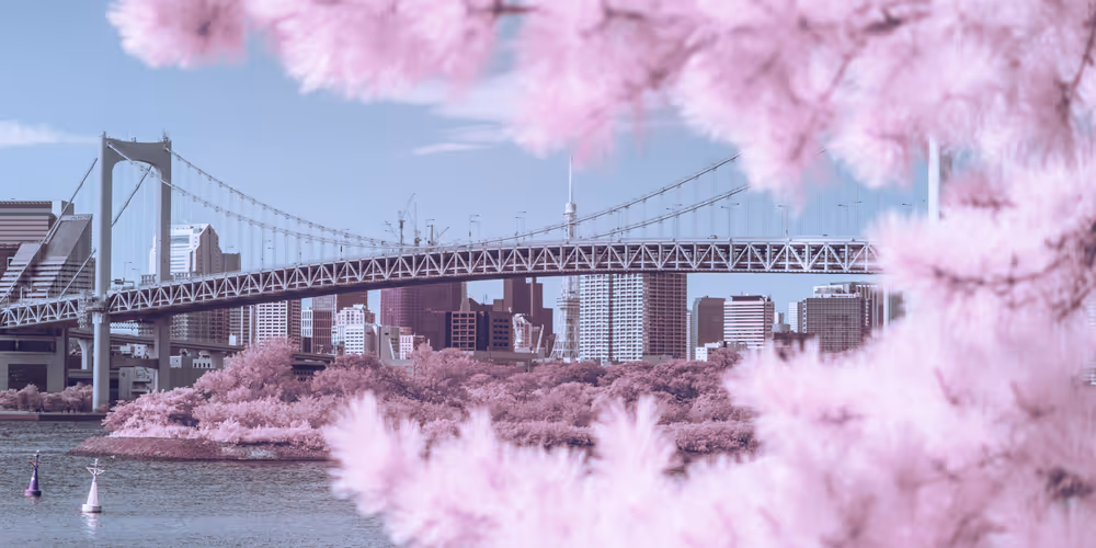 Rainbow Bridge over Fortune Pine Trees, with Tokyo Tower in the distance