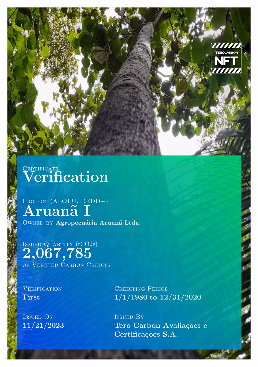 Aruanã I Project – Verified Carbon Credits Verification Certificate