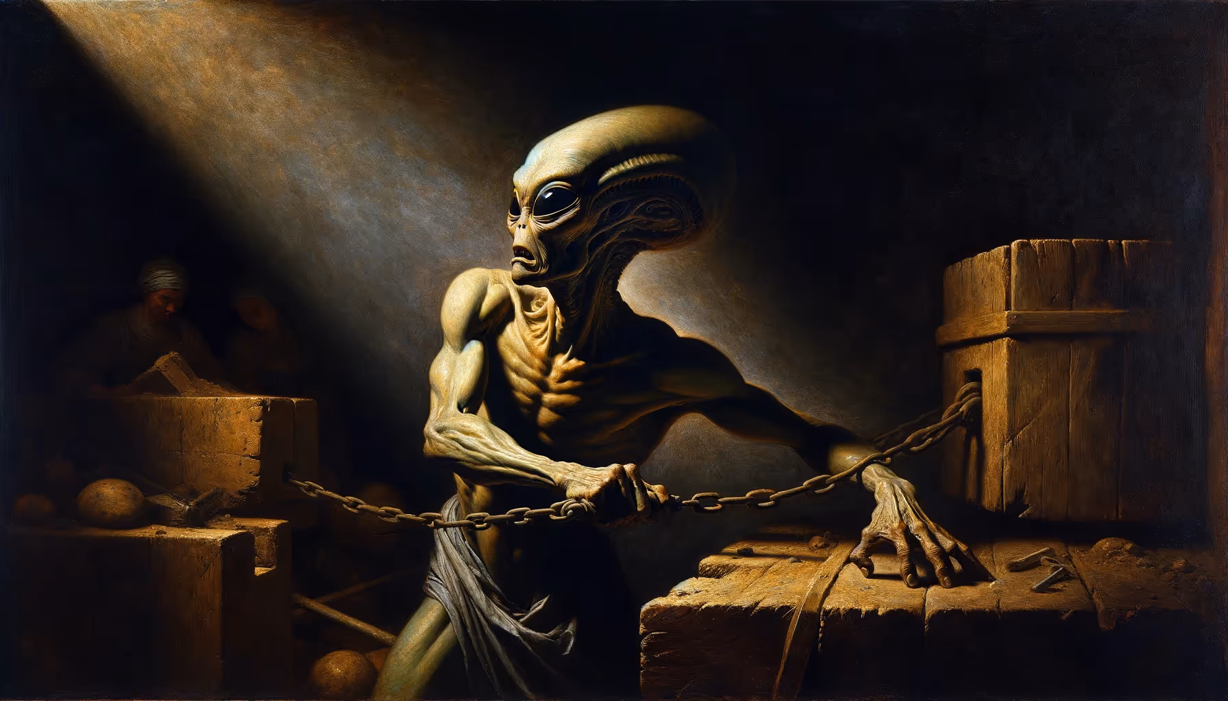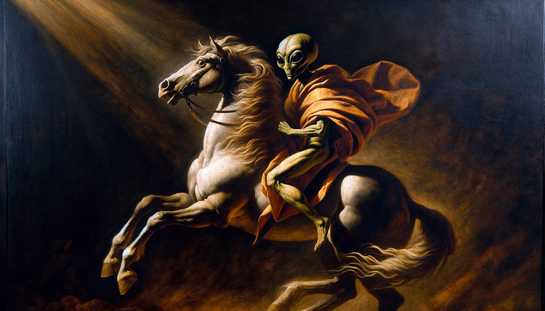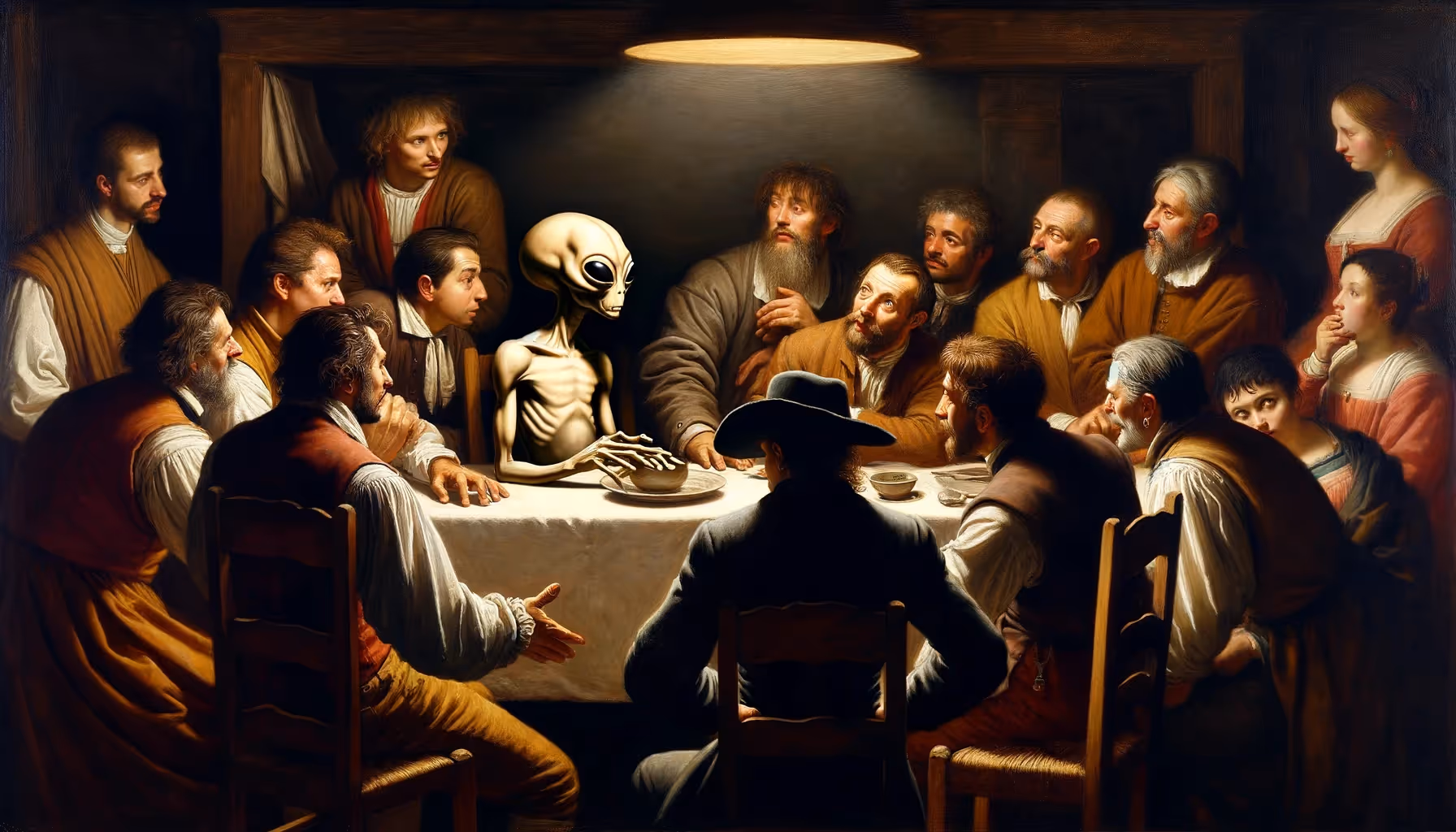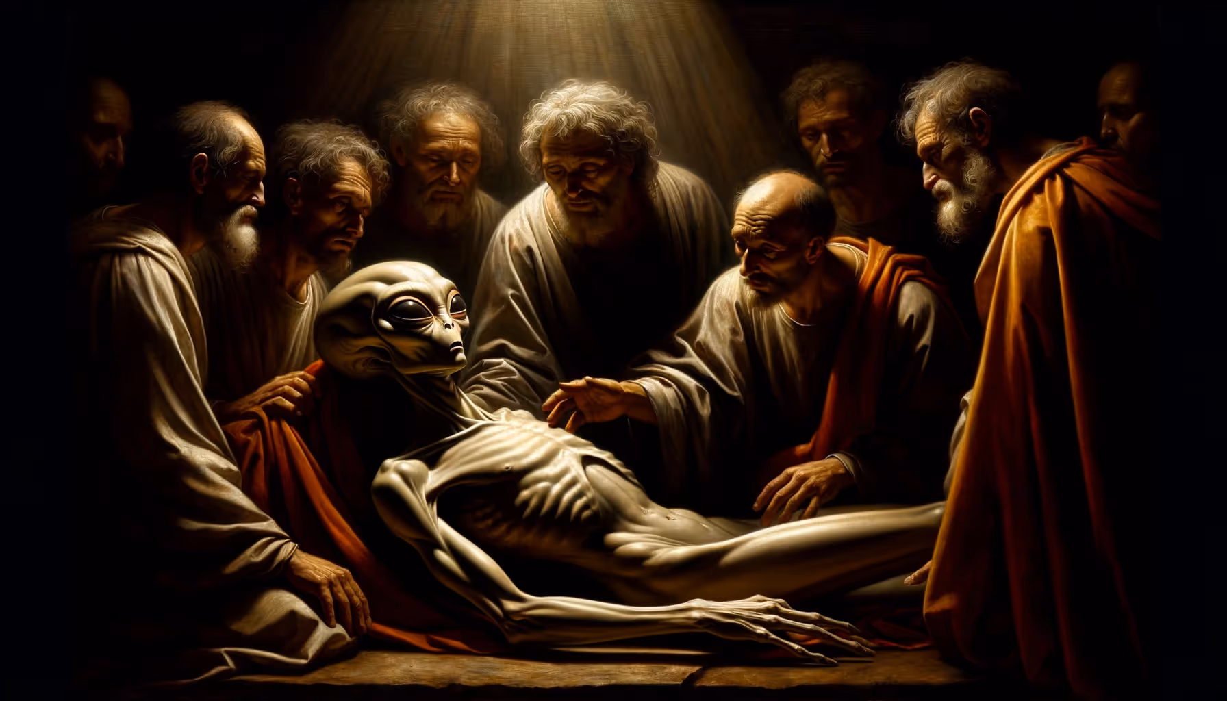 In each piece, aliens are integrated in a way that makes them seem a natural part of the Renaissance scenes. This include aliens dressed in period attire, interacting with human figures, or even depicted as subjects in religious or mythological scenes.