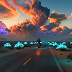 A lone motorcyclist rides through a desolate, alien landscape
