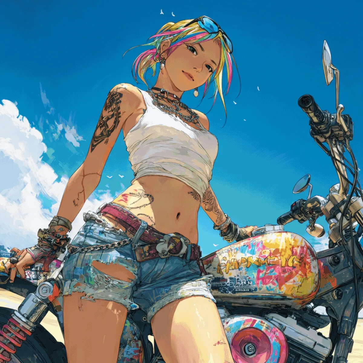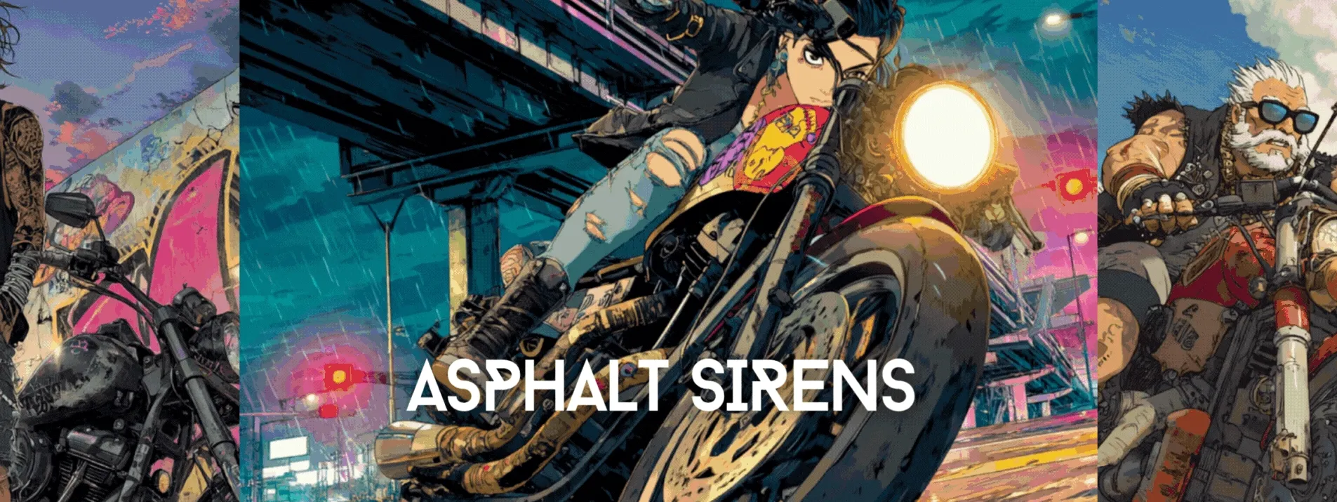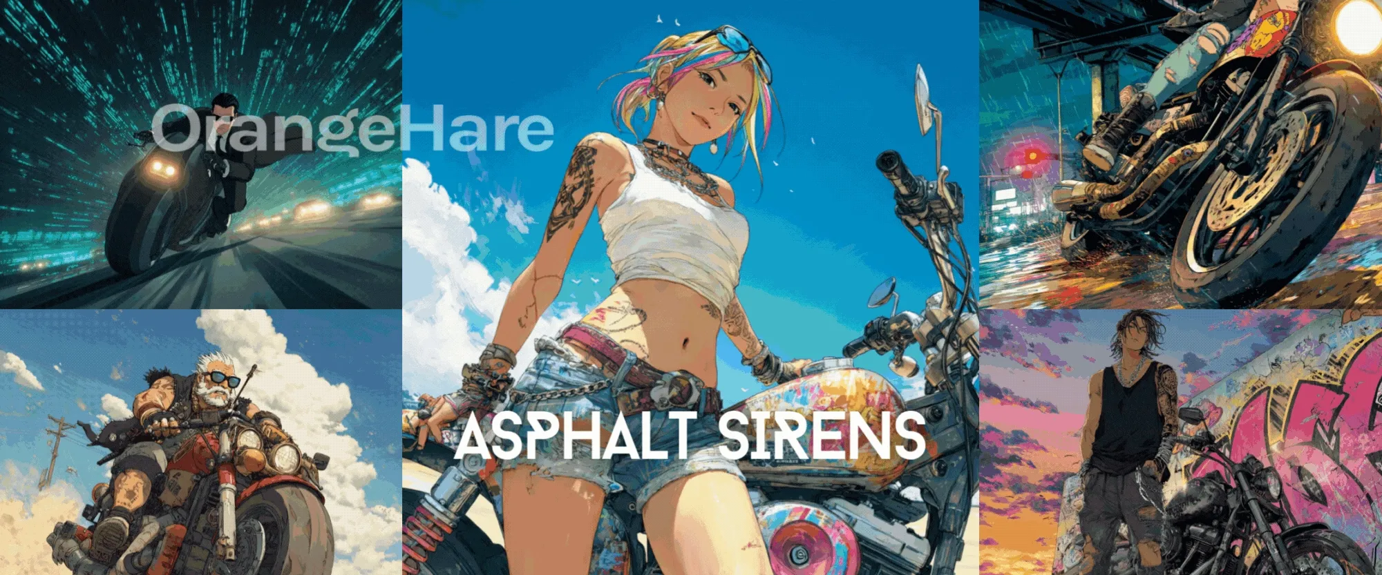 What happens when you kick the crew, but can't quite quit the open road? In "Asphalt Sirens," a mixed cast of riders—women and men, solos and duos—trade turf wars for open lanes, ripping across bridges, back-alleys, and coastlines with nothing but blue skies and horizons to chase. Across five categories and 86 NFTs, the set sits inside the Orangehare Syndicate universe but tells the afterstory: engines over emblems, distance over drama, pedal to the metal with no colors to claim. Here the siren isn’t a warning but a call—to outrun the past, and ride toward whatever comes next, whenever that may be.
