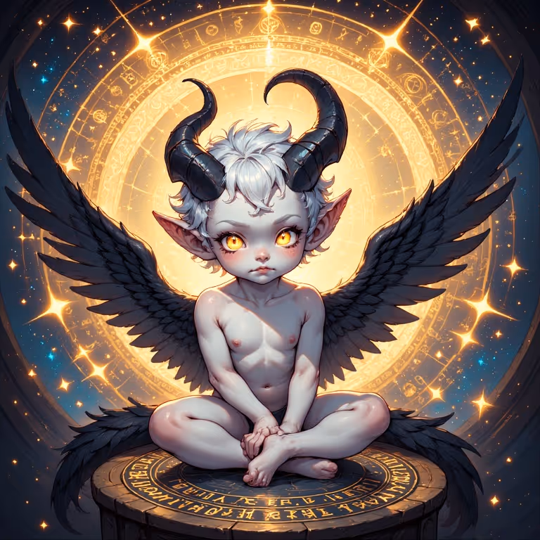 A celestial newborn sitting in silence, its dark wings stretched wide as glowing golden eyes pierce through the cosmic void. Tiny horns crown its head, symbols of power and mystery, while sacred runes shimmer beneath the stone pedestal where it rests. This artwork embodies the dual essence of innocence and enigma — a childlike figure born from starlight and shadow, carrying both purity and ancient wisdom.