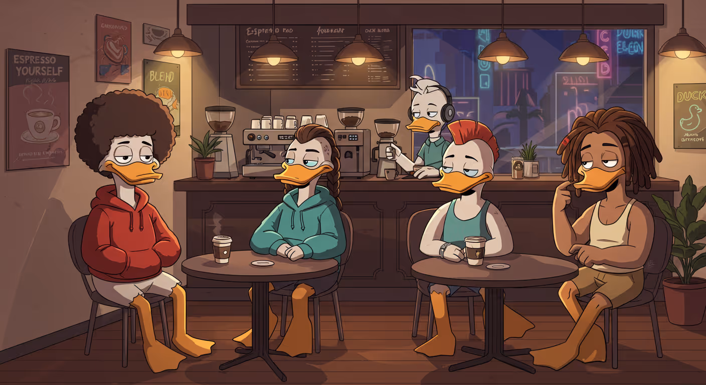 Feather Finn: "Exactly! I mean, imagine this—'The Quack Café.' Cozy vibes, top-notch coffee, and ducks from all over the blockchain flocking here to chill. Way better than driving in circles!"