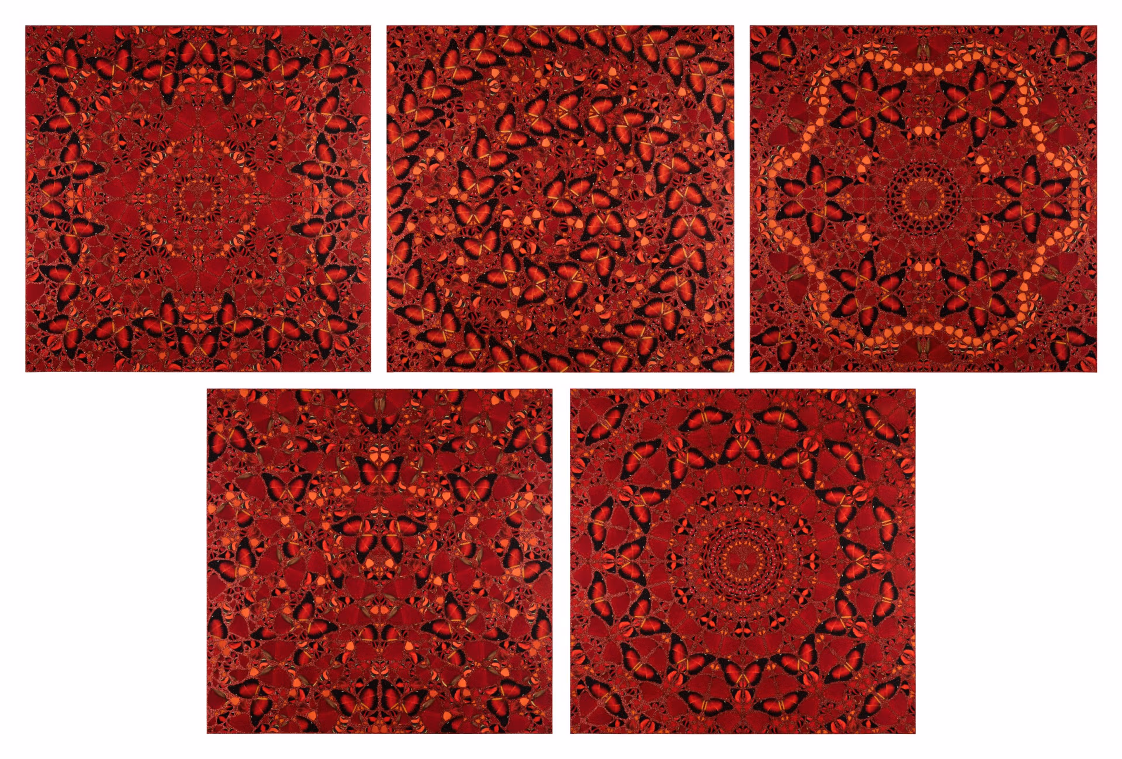 Since the beginning of his career Hirst has interacted with the butterfly, one of his best-known motifs. Inspired by a chance encounter in his studio and the intricate patterns found on Victorian tea trays, in The Empresses Hirst develops on the complex compositions he invented in his Kaleidoscope Paintings and Mandalas series.