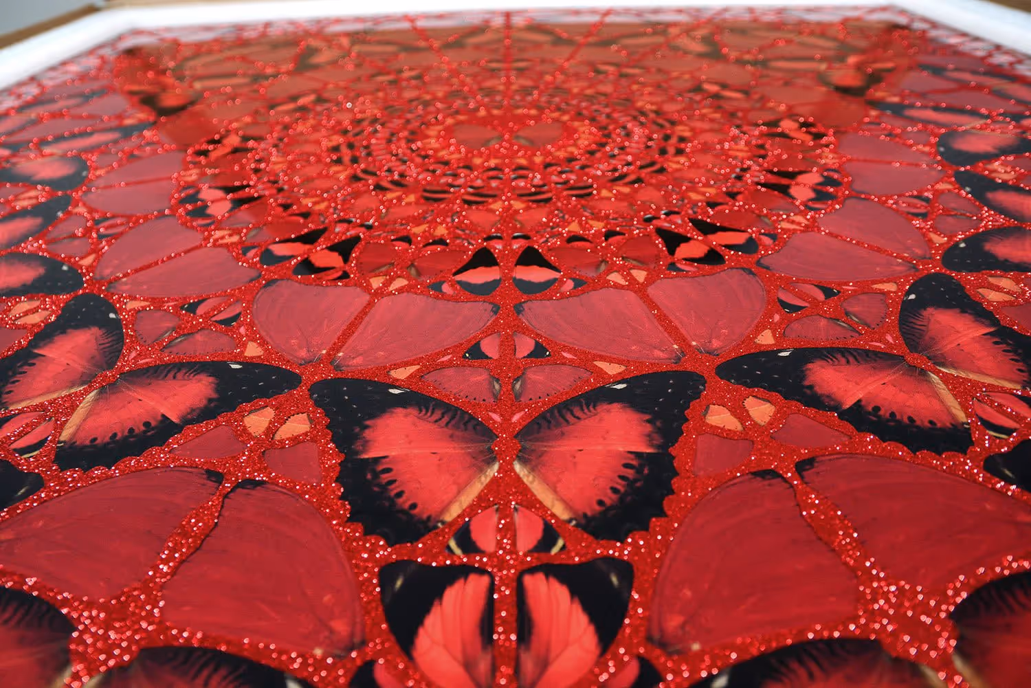 The images of wings inspire awe and are framed by glitter, a fantastically tactile material previously used by Hirst in his paintings. Glitter is loved for its playfulness and joy – a sentiment echoed in the play-on-words of the series title itself, which alludes to both female rulers and the Empress Butterfly.