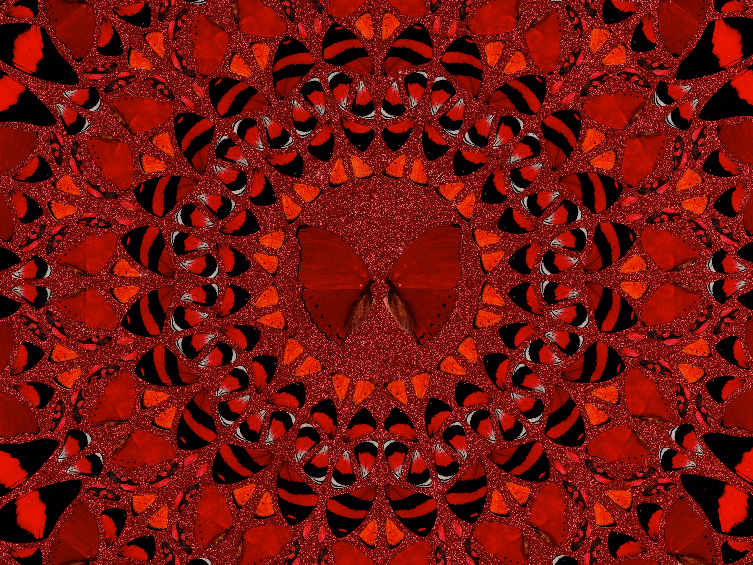 The striking Empresses prints are constructed of beautiful images of red butterfly wings, which are intricately arranged with a filigree of red glitter to produce visually intoxicating kaleidoscope-like effects. The prints are named after five exceptionally influential female rulers: Wu Zetian, Nūr Jahān, Theodora, Suiko and Taytu Betul. Their characters and stories are enhanced by the dominant red tone of the series, which deals with themes such as life, war, power, anger, love, joy and luck.