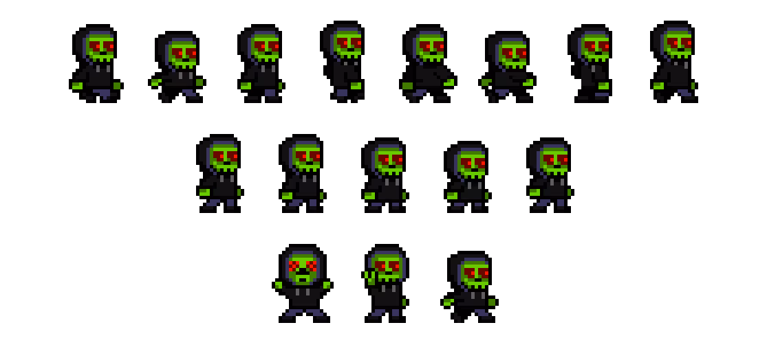 I designed the character within a 24×24 pixel canvas. Once the base design was done, I created different animations and grouped them into sprite sheets to bring the character to life in the game: