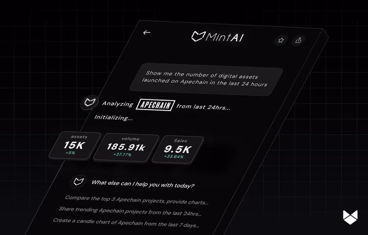 MintAI is Mintify’s intelligent trading assistant—bringing the power of large language models to on-chain execution. Traders can interact with MintAI using simple, conversational prompts to initiate trades, scan for opportunities, or surface historical trends. The system delivers personalized discovery by tailoring asset feeds based on a user’s trading history, while advanced analytics tools allow for precise on-chain queries and custom insights. Operating seamlessly across top chains like Ethereum, Arbitrum, Optimism, Base, Apechain, Bitcoin, and more, MintAI gives traders a unified, intelligent edge—complete with mispricing detection for NFT traits and hidden alpha across collections.