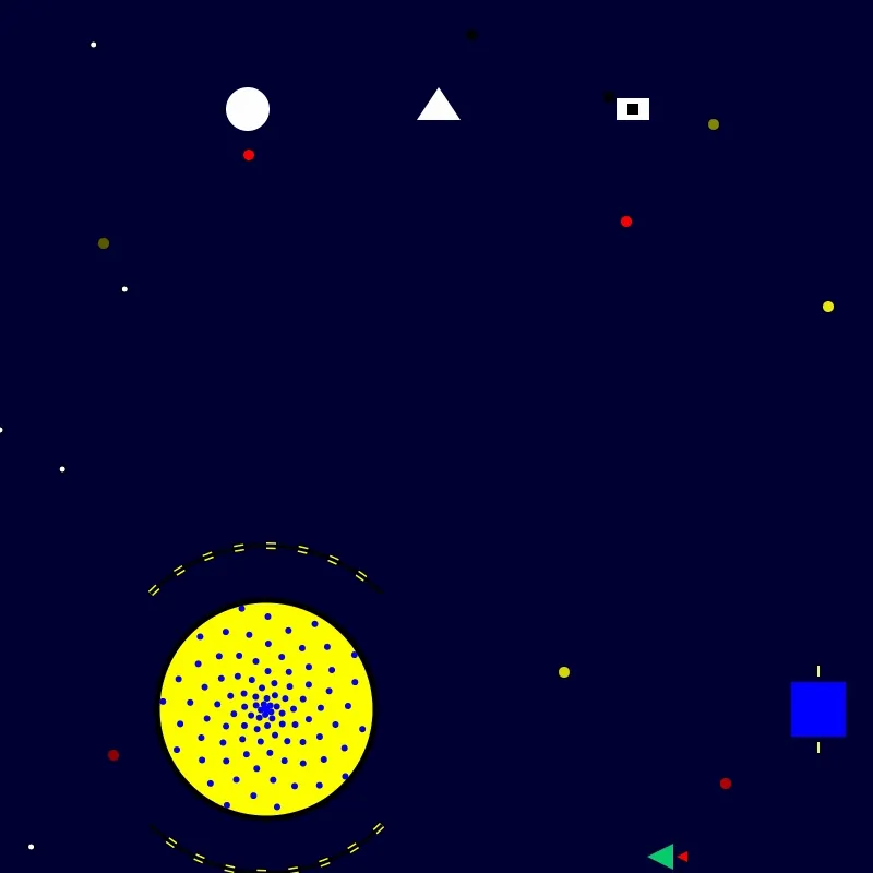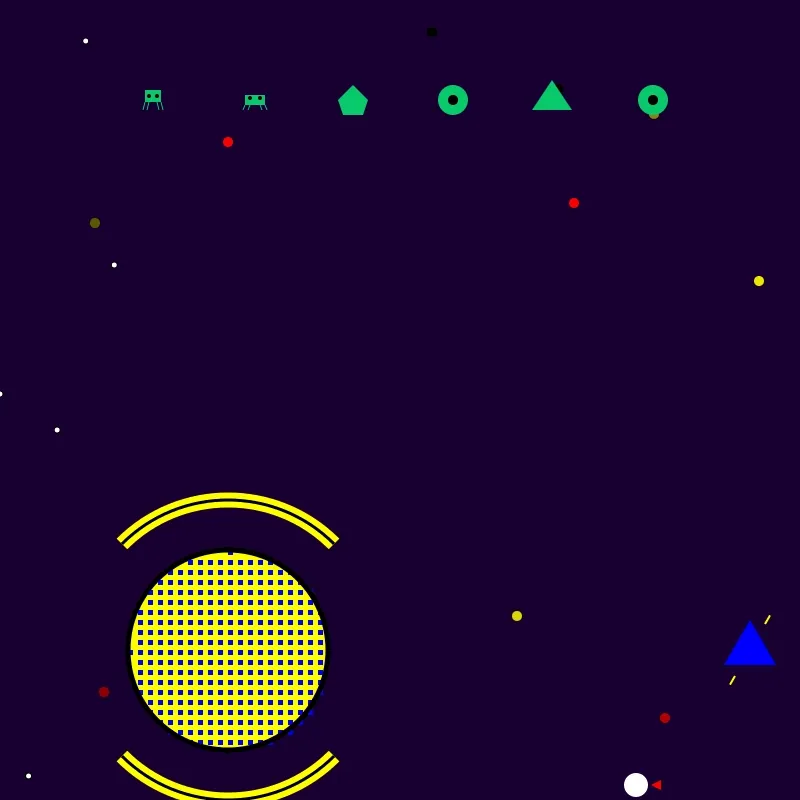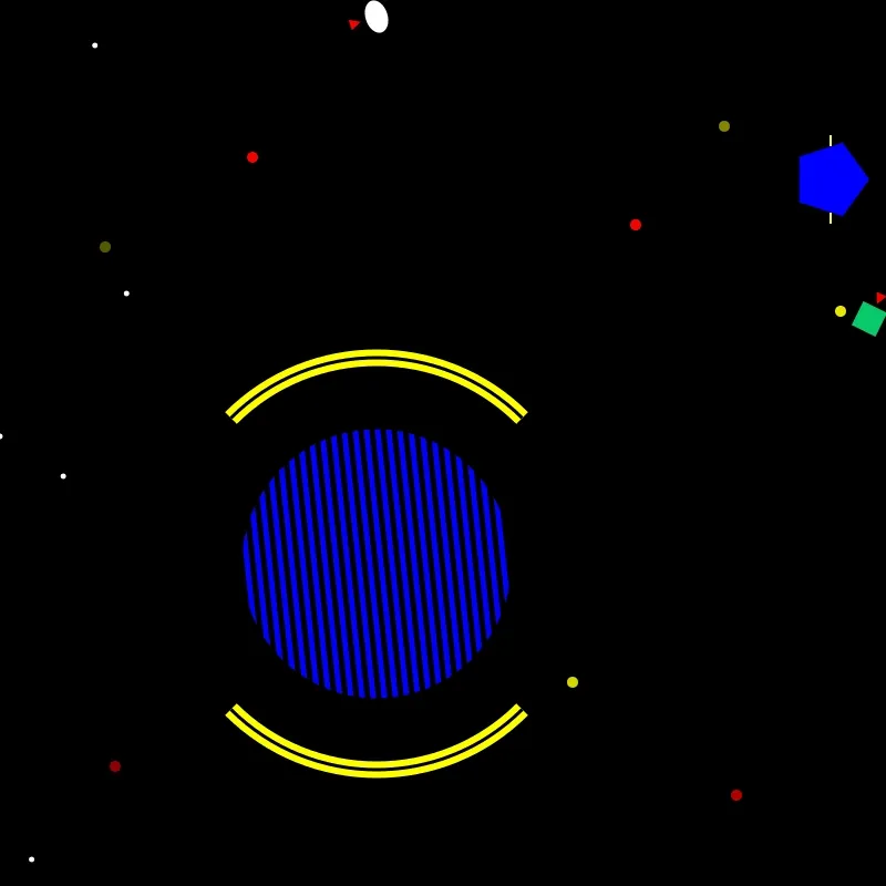 Custom pop-art style inspired by Roy Lichtenstein, using a predefined color palette (red, blue, yellow, black, white, green). Procedural generation of cosmic scenes with planets, spaceships, aliens, and dynamic text overlays. Frame-by-frame animation (140–180 frames per NFT) with a duration of 0.1s per frame, saved as optimized GIFs. Ben-Day dots, striped fills, and new pop-art patterns (e.g., zigzag, radial, checkerboard) for planet designs.