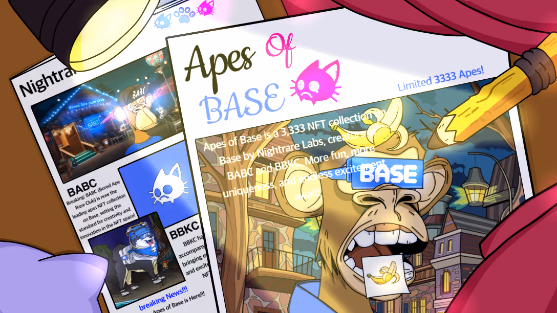 Apes of Base is an exclusive NFT collection featuring 3,333 uniquely designed digital apes, hosted on the Base blockchain. Created by NightRare Labs, the team behind the successful collection BABC and BBKC,Apes of Base aims to bring fresh energy to the NFT space with its distinctive style and engaging community-focused experiences.