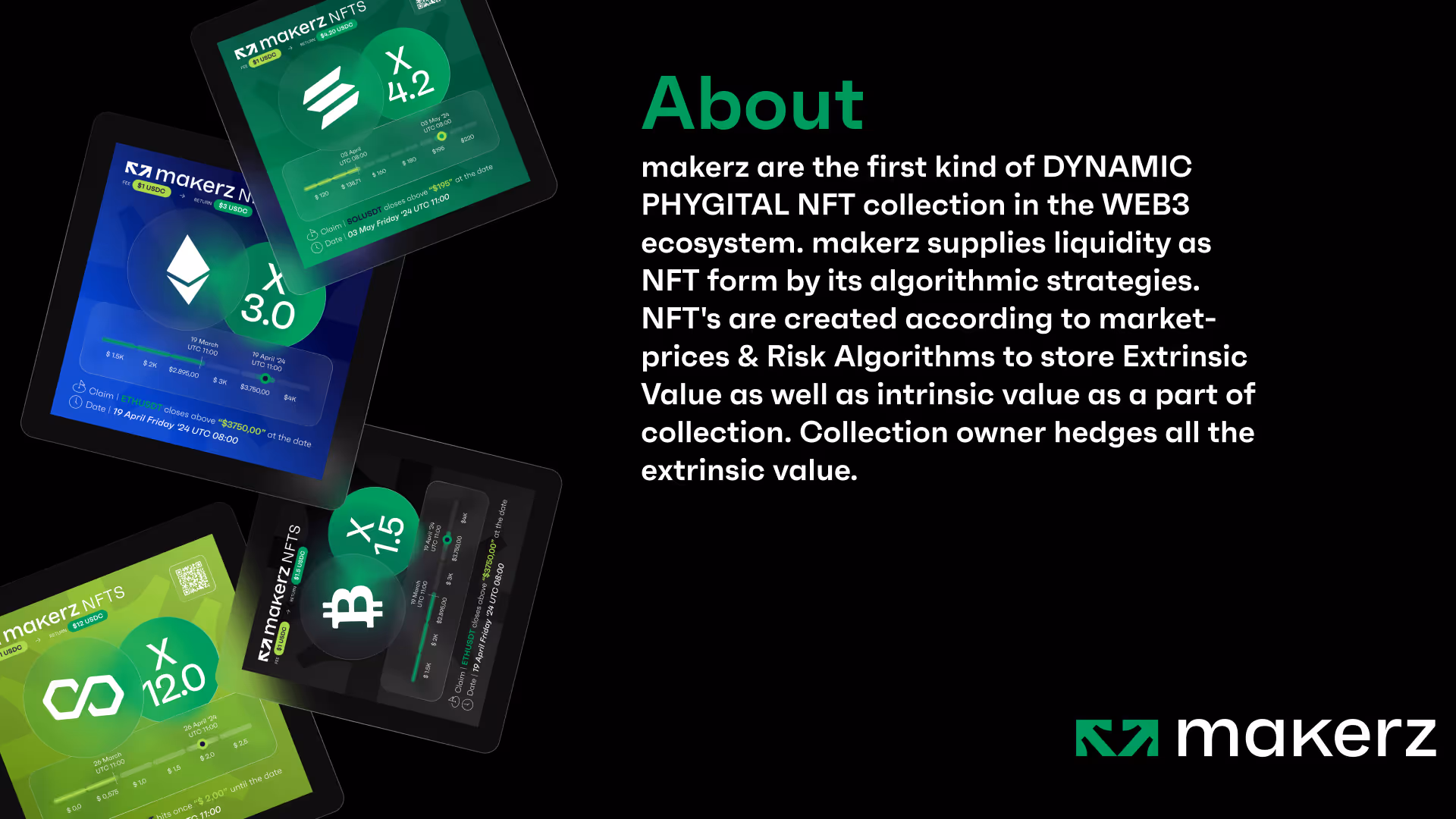 Makerz NFTs are the first kind of DYNAMIC Phygital NFT collection NFTs are created according to market-prices & Risk Algorithms to store Extrinsic Value as well as intrinsic value as a part of collection. Collection owner hedges all the extrinsic value.