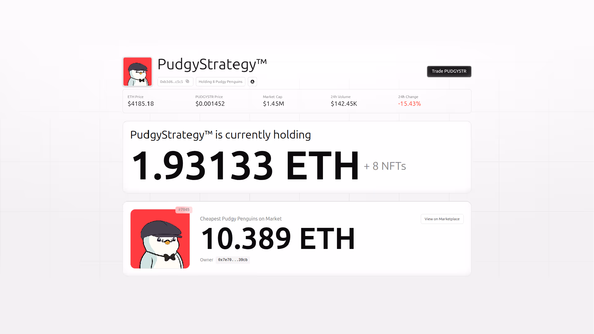 PudgyStrategy links $PDGYSTR token trades to the acquisition of floor Pudgy Penguins. Each Penguin is relisted higher, and when it sells, all proceeds are burned into the token supply—fueling a perpetual scarcity cycle.